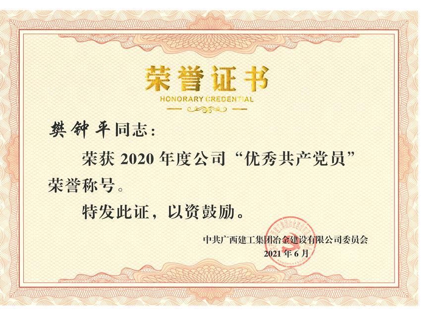樊鐘平被評為2020年度冶建公司優(yōu)秀共產黨員