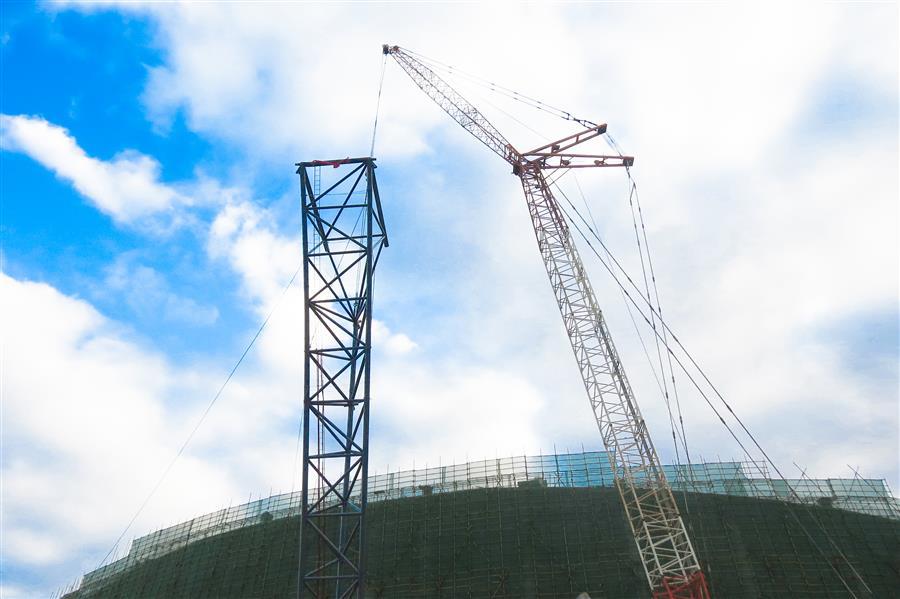 靖西市乒乓主題體育公園鋼結(jié)構(gòu)罩棚空間桁架采用三角桁架形式,桁架柱向外傾斜,與地面夾角呈65°,重量達(dá)25噸,桁架柱即徑向桁架為三角管桁架,整體結(jié)構(gòu)呈倒L形,根據(jù)其受力特點可分為懸挑式和前端支承式,懸挑式根部設(shè)置撐桿,撐桿連接在看臺勁性柱上。此次桁架吊裝難度大、技術(shù)要求高,項目部從構(gòu)件進(jìn)場、精準(zhǔn)定位、吊裝,每一道工序、每一個環(huán)節(jié)都實行全過程無縫隙標(biāo)準(zhǔn)化管理,全力確保安裝和細(xì)節(jié)符合技術(shù)要求。