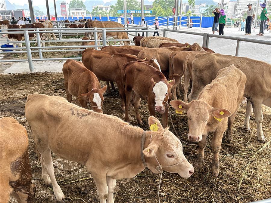 活動(dòng)現(xiàn)場(chǎng),熱鬧非凡,大家參觀了農(nóng)特項(xiàng)目園區(qū)及桂中牛行,并對(duì)園區(qū)今后的發(fā)展提出了意見和建議。桂中牛行作為農(nóng)特項(xiàng)目園區(qū)內(nèi)的首個(gè)主力商家,主營活牛羊交易,副營馬、驢、騾子等草食動(dòng)物交易。試業(yè)當(dāng)天,牛群“哞哞”聲此起彼伏,一頭頭體格健壯的牛兒一字排開,人們?nèi)宄扇旱貒墼谝黄?,仔?xì)挑選著心儀的牛兒。一旁的牛崽交易市場(chǎng)內(nèi),買家更是爭相搶購體態(tài)良好的牛崽,市場(chǎng)交易紅火。