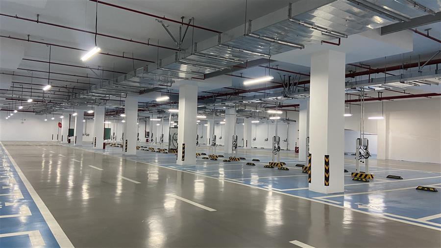 項目總建筑面積約2.7萬平方米,為一座兩層局部覆土式地上停車庫,建設(shè)內(nèi)容包含停車場、地面廣場鋪裝及綠化、給排水、電氣、消防等附屬工程。項目建成將新增600個機動車位,其中負二層510個機動車位,負一層78個有充電樁的新能源停車位,屋面12個無障礙車位;另外,停車庫屋面設(shè)有283個非機動車位。綠地率為60%。停車場內(nèi)部空間寬敞明亮,外觀看像是地下停車庫,但實際上由于該區(qū)域地勢較低,為合理規(guī)劃,特意將停車庫設(shè)計為地上兩層局部覆土式停車庫,即在停車庫上方回填泥土,在泥土上種植綠化樹木,將車庫上方裝點成一個小公園。項目交付運營,有效緩解三門江森林公園周邊“停車難”問題。