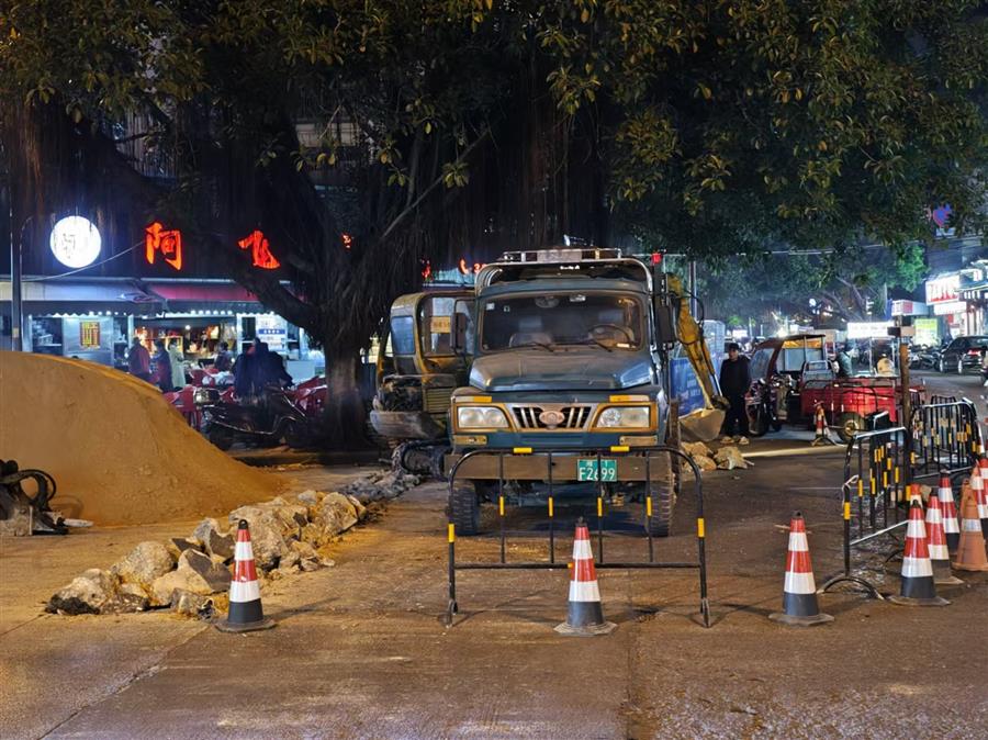 晚上11點(diǎn)多,施工人員在航銀路施工作業(yè)