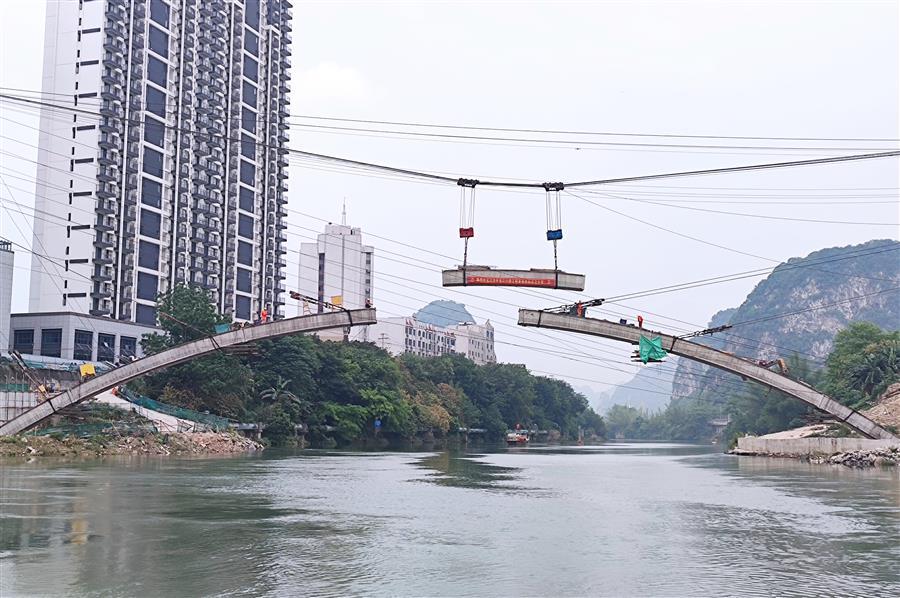 8:28分,隨著現(xiàn)場指揮員一聲口令,首條拱肋最后一節(jié)砼拱箱被纜索吊緩緩吊起,向橫跨在龍江河上的主拱圈移動(dòng)。25分鐘后,第七片拱箱精準(zhǔn)吊裝就位,河池市龍江六橋(輝樂橋)首條拱肋順利合攏。