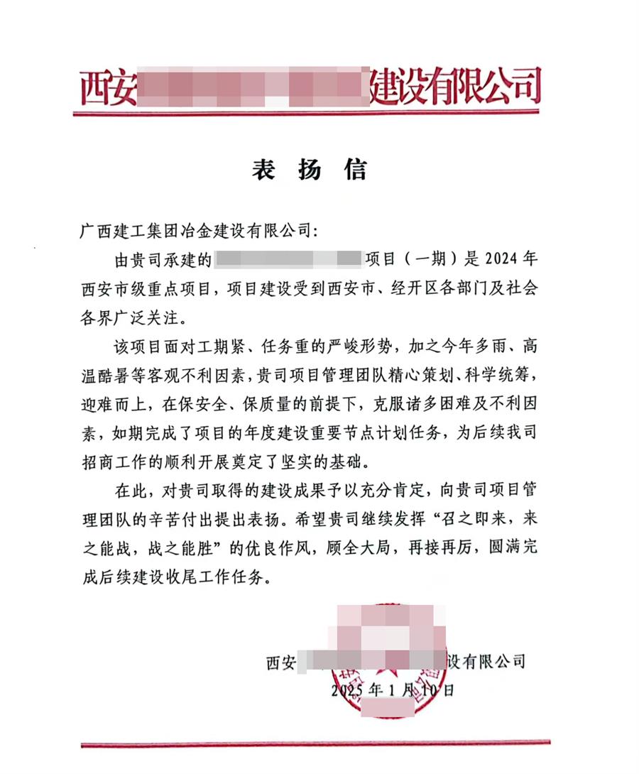 來信稱,冶建公司在項(xiàng)目施工時(shí)間緊、任務(wù)重的嚴(yán)峻形勢(shì)下,精心策劃、迎難而上,一手抓安全一手抓質(zhì)量,克服諸多困難及不利因素,如期完成了項(xiàng)目的年度建設(shè)重要節(jié)點(diǎn)計(jì)劃任務(wù),為后續(xù)招商工作的順利開展奠定了堅(jiān)實(shí)的基礎(chǔ)。